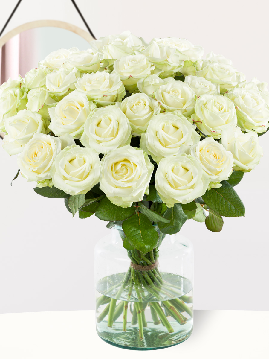 Deze kwaliteitsrozen gekweekt door v. d. Berg Roses doen iedereen verbazen. De lengte van de stelen zijn 60 centimeter, waardoor deze prachtige witte rozen op een passende ruime vaas volledig tot haar recht komen. Geef deze witte rozen cadeau met een persoonlijk bericht op het gratis kaartje die toegevoegd wordt aan de verzenddoos. Zijn 30 van deze mooie witte rozen niet het juiste aantal dat je zoekt. Laat je dan verrassen door ons ruime aanbod van witte rozen (), of kies je eigen aantal witte rozen () voor een bijzondere belevenis bij een speciaal evenement. Geef bijvoorbeeld 25 of 50 witte rozen bij een jubileum, of kies het aantal rozen dat symbool staat voor de leeftijd van de jarige. Deze witte rozen zullen door iedereen als waanzinnig cadeau gezien worden en nog meer gewaardeerd worden wanneer het lange vaasleven van deze witte rozen tot uiting komt.