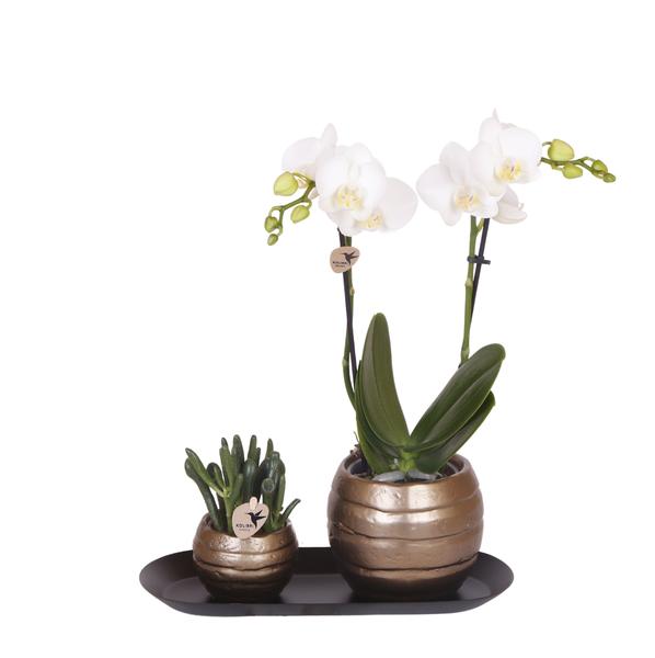 Ga jij voor een industrieel of donker interieur? Dan past deze plantenset hierbij! In de set staan de witte orchidee Amabilis en Succulent in de koperkleurige sierpotten met een potmaat van 6 en 9 centimeter. Natuurlijk is een set niet compleet zonder een dienblad en hebben we het zwarte, ovale dienblad toegevoegd.