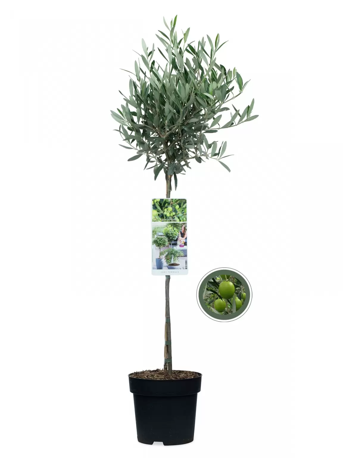 De olijfboom op stam geeft de tuin een prachtige mediterrane uitstraling. Het boompje heeft langwerpige, smalle bladeren die grijsgroen van kleur zijn. Het boompje bloeit in mei en juni met crème-witte bloemen en daarna kunnen er olijven aan het boompje groeien. Na de oogst wordt aangeraden om de takken die een vrucht hebben gedragen een stukje terug te snoeien. De olijfboom op stam is een groenblijvend boompje die op vrijwel iedere plaats in de tuin of in een bloempot op het terras kan staan. Hij staat het liefste op een lichte plaats uit de wind.
