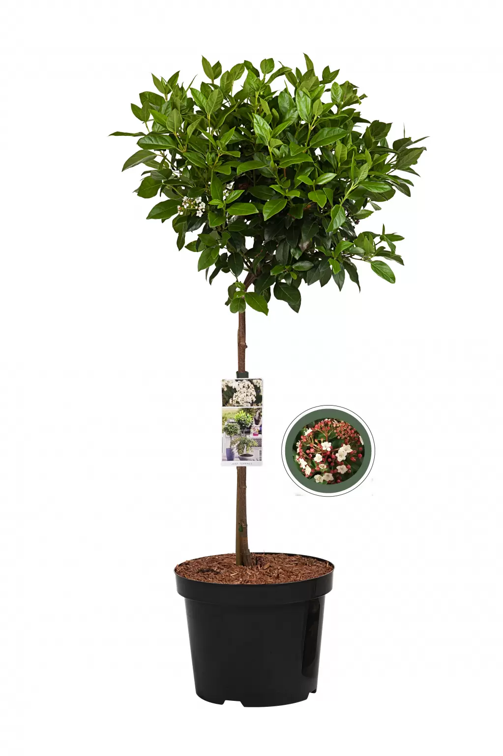 De sneeuwbal op stam is een prachtige winterbloeiende en compacte heester. De bladeren zijn het gehele jaar door glanzend en mooi donkergroen van kleur. Vaak vormt het boompje al vanaf oktober bloemschermen en bloeit daarna verder tot in maart-april. Een bloemscherm heeft een platte vorm en bestaat ook uit kleine roze gekleurde bloemknoppen. Uit deze bloemknoppen komen witte bloemen tevoorschijn. Na de bloei groeien er zwart/blauwe besjes aan het boompje. De sneeuwbal op stam is een groenblijvend boompje en kan zowel in de volle grond als in een bloempot op het terras staan. Geef hem daarbij een plekje in de zon of halfschaduw. Hoewel de Viburnum tinus een winterbloeiend boompjes is, heeft hij zelfs in de lente- en zomermaanden ook een mooie sierwaarde.